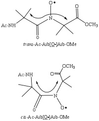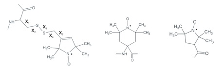 Nitroxide labels in use in biological systems (left - modified cysteine used in site-directed spin labeling; middle - semi-rigid TOAC fused to peptide backbone; right - proxylgroup, used to label amino terminals).